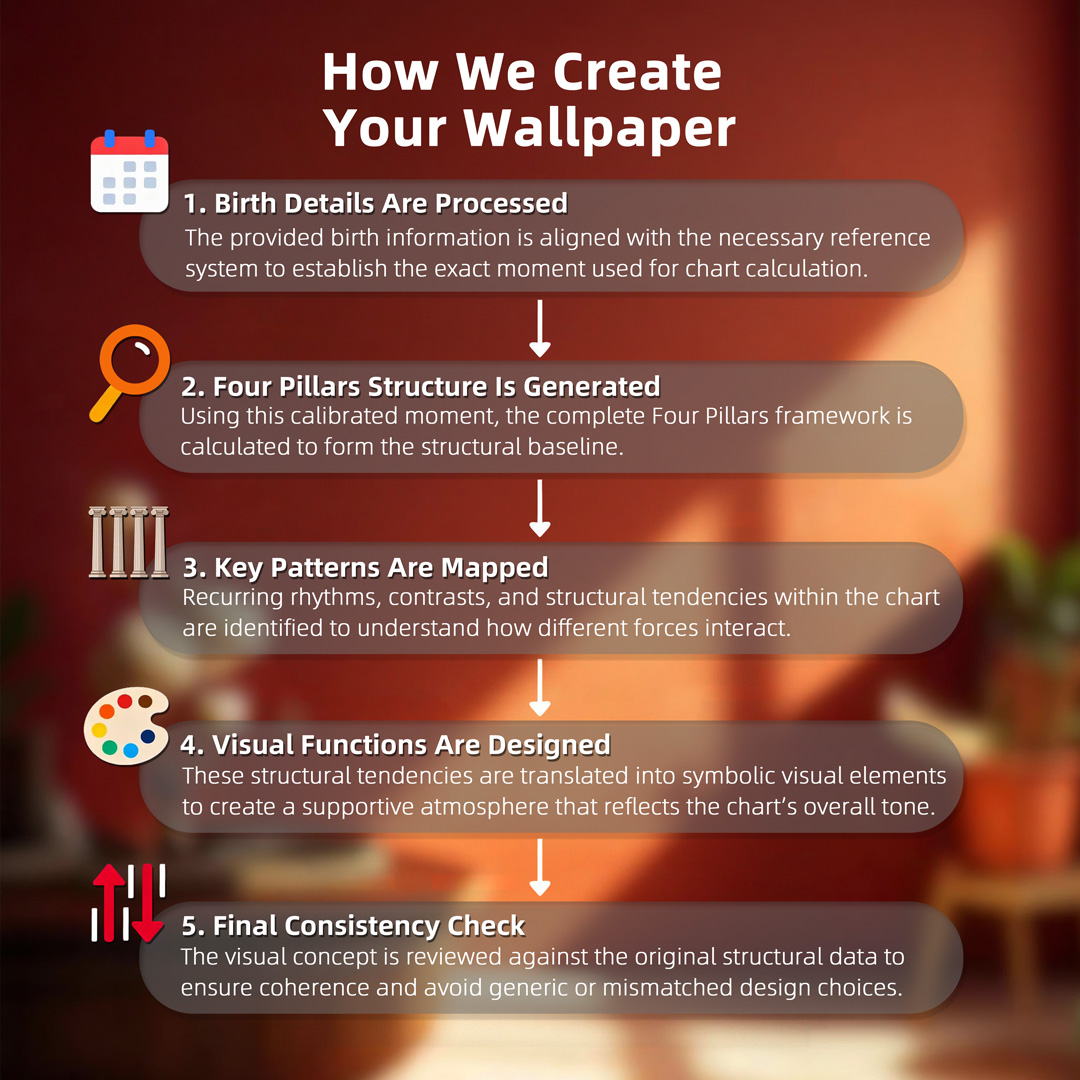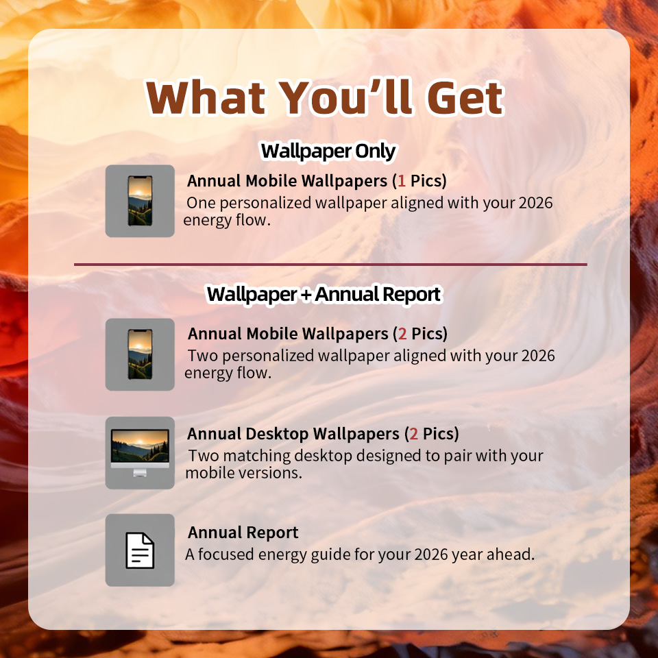 This wallpaper is designed based on the key energetic influences that may shape your experiences in 2025, reflecting the tension between external demands and your internal capacity, which may manifest as oscillation between striving for recognition and seeking inner stability. Its visual elements are intentionally arranged to gather and harmonize incoming pressures into a stable, nurturing core, supporting the stability and expression of your Earth energy. This arrangement helps you stay aligned with what you may benefit from most this year. (Wood over Earth + Fire support, controlling Metal conflicts)